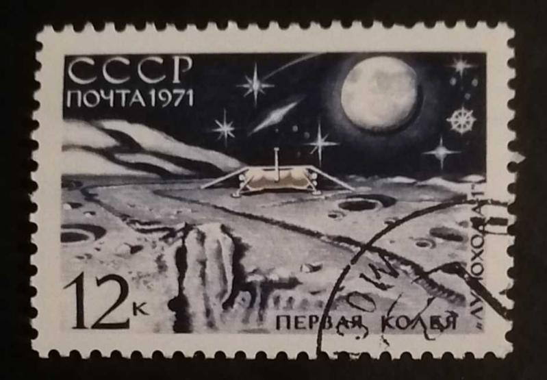 "Luna-17" Ay istasyonu ve dünyanın ilk uzaktan kumandalı Ay taşıtı olan Lunokhod-1 (Луноход-1). Bu damgalı (kullanılmış) kondisyondaki bir pulun tekil piyasa değeri yaklaşık 15 TL ile 30 TL (0.45 - 0.90 USD) arasındadır.