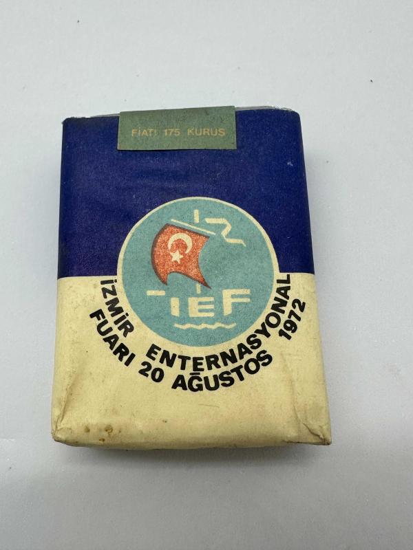1972 İzmir Enternasyonal fuarı Tekel midi sigara pakedi dolu açılmamış kolleksiyonluk başlıklı antika/koleksiyon objesi Türkiye menşe’lidir. 1960-1979 arası dönemine aittir.