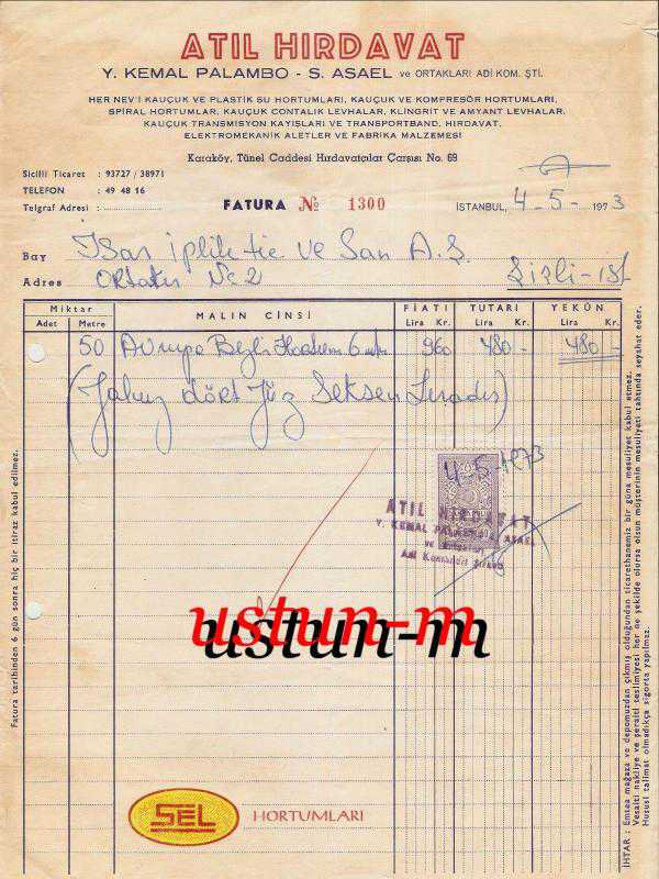 ** ATIL HIRDAVAT / Y.KEMAL PALAMBO - S.ASAEL ** 4 Mayıs 1973 tarihli,gayet temiz durumda orijinal faturadır.. .