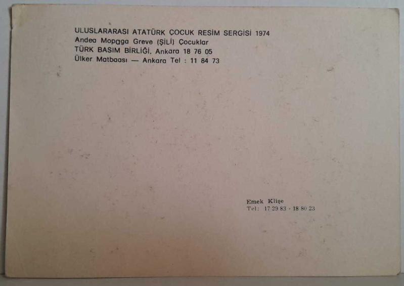 1974 ULUSLARARASI ATATÜRK ÇOCUK RESİM SERGİSİ ANDEA MOPAGA GREVE ÇOCUKLAR KARTPOSTALI,ARKASINA YAZILMAMIŞ,RENKLİ, 12 X 16 CM EBADINDA, en son 8 ay önce güncellenmiştir.