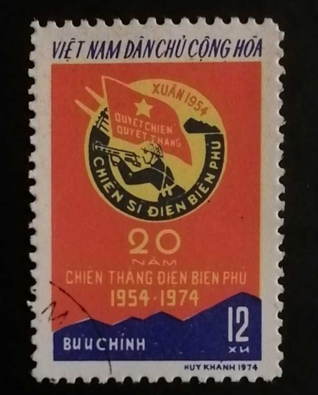 Bu pul, Kuzey Vietnam (Vietnam Demokratik Cumhuriyeti) tarafından 1974 yılında, Fransız sömürge yönetimine karşı kazanılan belirleyici zaferin 20. yıl dönümü anısına basılmıştır.