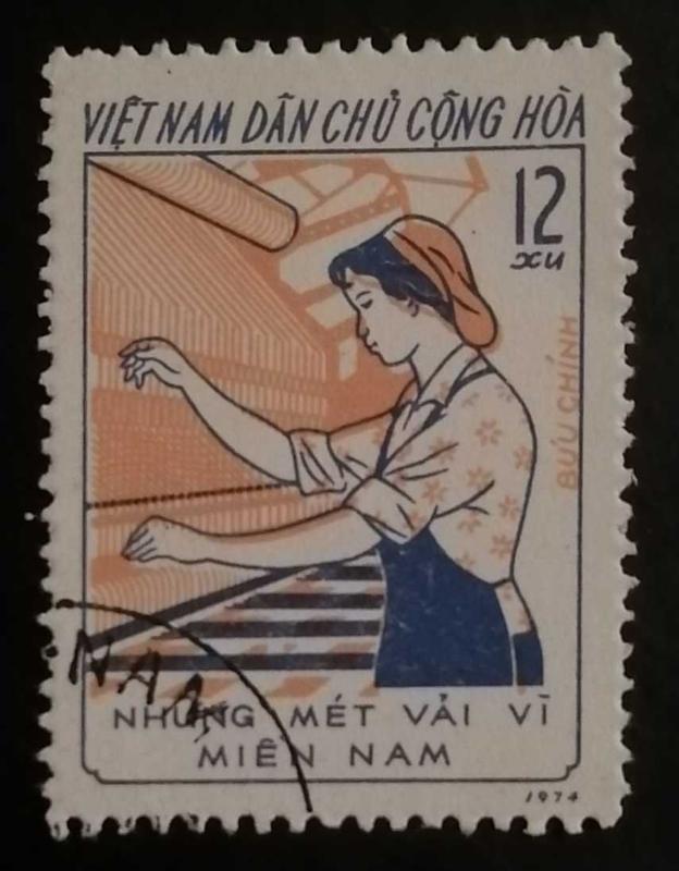 Üzerinde "Những mét vải vì Miền Nam" (Güney için metrelerce kumaş) yazmaktadır. 1974 yılında, savaş döneminde üretim seferberliğini ve Güney Vietnam'daki mücadeleye desteği simgelemek için basılmıştır. Maddi Değeri: Damgalı olduğu için yaklaşık 20 TL - 50 TL arasındadır. Tarihsel olarak savaşın son dönemlerini yansıtması açısından ilgi çekicidir.