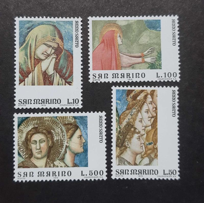 Bu görselde, San Marino tarafından 1975 Kutsal Yılı (Anno Santo) anısına çıkarılan, ünlü ressam Giotto'nun eserlerini konu alan pul serisi görülmektedir. Ülke: San Marino. Yıl: 1975. Tema: Kutsal Yıl ve Giotto tabloları. Özellik: Damgasız (MNH - Mint Never Hinged) koleksiyon parçalarıdır.