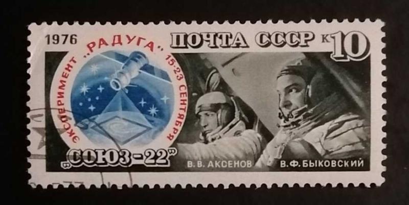 Soyuz-22 "Raduga" (Gökkuşağı) Deneyi Pulu (1976) Konu: 15-23 Eylül 1976 tarihleri arasında gerçekleşen Soyuz-22 misyonu. Bu görevde, Doğu Almanya (DDR) üretimi çok bantlı MKF-6 kamera sistemi kullanılarak dünya yüzeyinin fotoğraflanması deneyi ("Raduga" deneyi) yapılmıştır. Fiyat: Damgalı ve temiz bir örneği koleksiyon piyasasında yaklaşık 10 TL - 20 TL (yaklaşık 0,30 - 0,60 EUR) arasındadır.