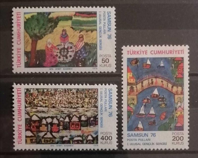 Bu üç pul, 1976 yılında Samsun'da düzenlenen I. Ulusal Gençlik Sergisi anısına basılan çok renkli ve neşeli bir seriye aittir.