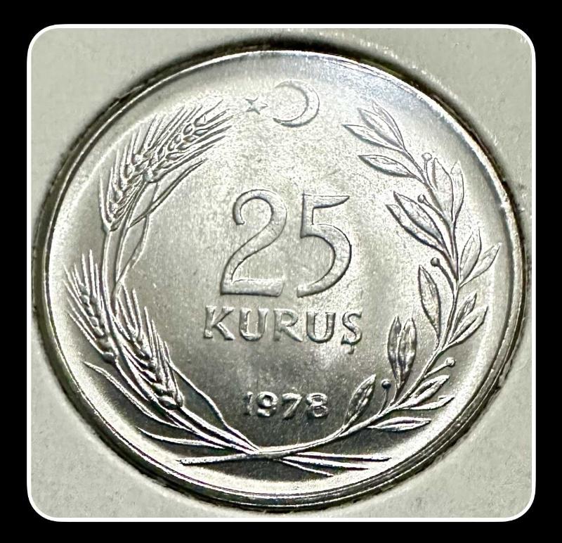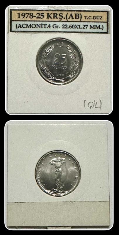 Acmonital 25 Kuruşlar 1959-1978 arası basılmış olup; 17 Adet 25 Kuruş için EN AZ BASILAN (185.000 Adet) 1978 25 Kuruş’tur, Çil bulmak zordur, hem T.C Düz hem de T.C Ters için geçerli bir bilgidir. NÜMİSMANİA YILDIRIM KOLEKSİYON GARANTİSİ İLE İADESİ VARDIR