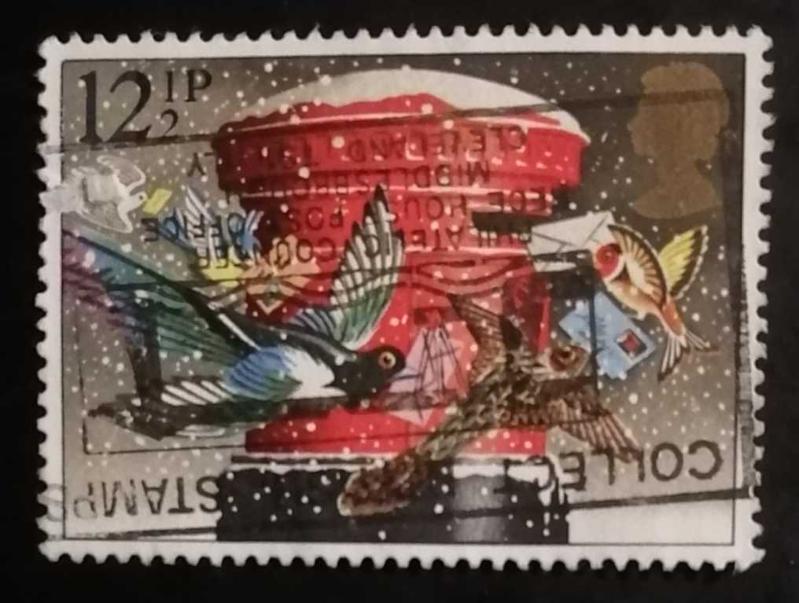 Bu pul Birleşik Krallık’a ait 12½p değerli bir Noel pulu 🎄📮 Üzerindeki kırmızı post kutusu ve etrafındaki kuşlar tasarımıyla 1979–1981 civarı basılan Noel serilerinden biridir. Arka plandaki kar efekti ve Royal Mail post kutusu tipik İngiliz Noel temasıdır. Kullanılmış (damgalı): yaklaşık 0,20 – 0,80 USD