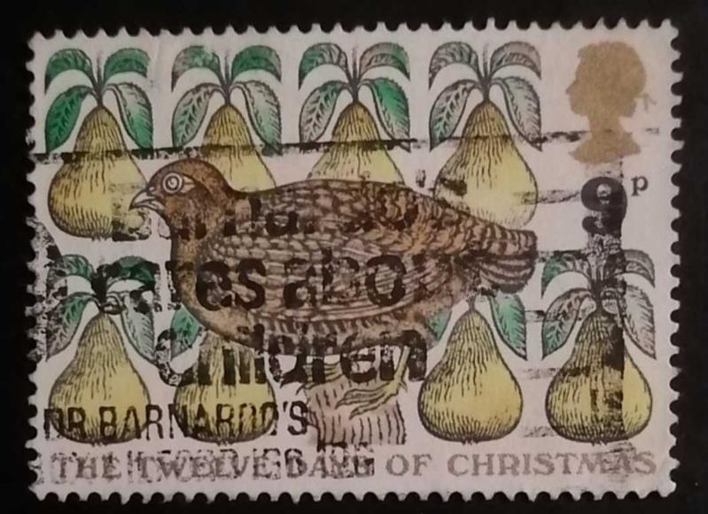 Bu pul Birleşik Krallık’a ait 9p değerli bir Noel puludur 🎄 Alt kısmında “The Twelve Days of Christmas” yazıyor — yani ünlü İngiliz Noel şarkısına gönderme yapıyor. Üzerindeki kuş ve armutlar da şarkının ilk dizesi olan “A partridge in a pear tree” (Armut ağacındaki keklik) temasını gösteriyor. Ayrıca üzerinde “Dr Barnardo’s” ibaresi var. Bu, İngiltere’de çocuklara yardım eden hayır kurumu Barnardo's adına basılmış özel baskı/overprint versiyon olabilir. Normal 9p versiyon (damgalı): 0,20 – 0,80 USD Dr Barnardo’s overprintli versiyon: 0,50 – 2 USD (duruma göre)