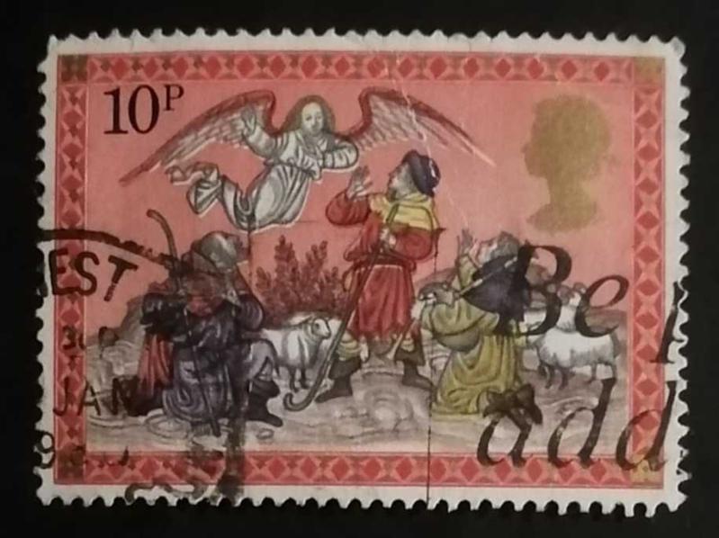 Tema: Çobanlara müjde sahnesi (melek ve çobanlar) – Orta Çağ el yazması / minyatür tarzında dini sahne. Sağ üstteki siluet: Elizabeth II Kullanılmış (damgalı): 0,25 – 1 USD (10–35 TL civarı)