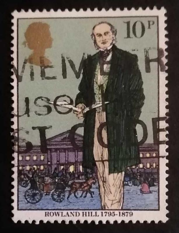 Yeni görseldeki bu pul, modern posta sisteminin babası olarak kabul edilen Sir Rowland Hill anısına Birleşik Krallık (Royal Mail) tarafından 1979 yılında basılan bir hatıra puludur.