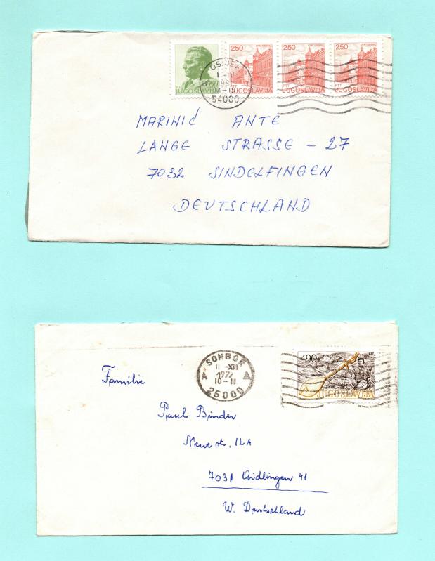 Posta tarihi koleksiyonerleri dikkatine, belirli bir posta tarifesini karşılamak için çeşitli pulların kullanıldığı, gerçek posta dolaşımı görmüş filatelik zarflar 1. Zarf üzerinde 1 adet yeşil renkli Mareşal Tito portreli pul ve 3 adet aynı, kırmızı renkli bina/saray konulu üçlü pul vardır. OSIJEK posta merkezinden, 1 IV 1981 tarihinde Almanya'ya postalanmıştır. Damga okunaklıdır. 2. Zarf üzerinde tek bir pul kullanılmıştır. Yugoslavya 25 Ekim1977 Müze Sergileri - Ulusal Enstrümanlar serisinden bir puldur.SOMBOR posta merkezinden Almanya'ya gönderilmiş, 10-XII-1977 tarihli, okunaklı bir damgası vardır.