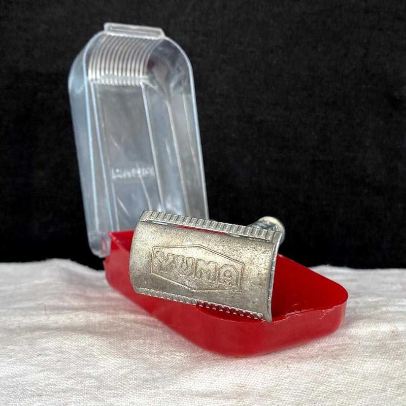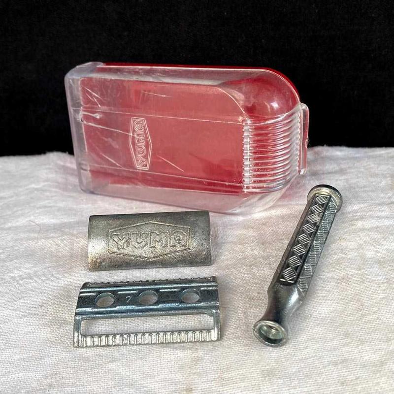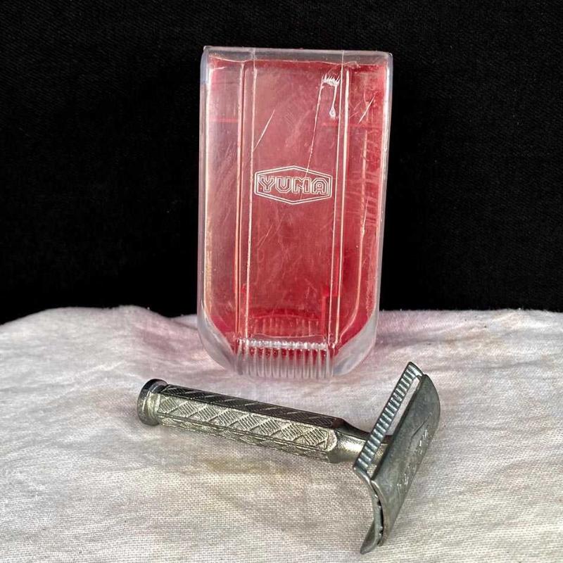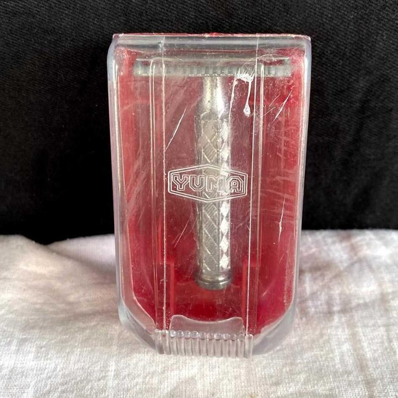 1980'lerin yerli üretimi Yuma marka tıraş bıçağı. Tıraş bıçağı üç parçadan oluşan (kafa, alt tabla ve sap) klasik bir emniyetli tıraş bıçağıdır. Metal alaşımdan üretilmiştir. Sap kısmında tutuşu kolaylaştıran baklava desenli bir doku mevcuttur. Üst kapak üzerinde ikonik altıgen çerçeve içinde "YUMA" logosu kabartmalı olarak yer alır. Alt kısmı kırmızı, üst kapağı şeffaf plastikten oluşan, üzerinde markanın logosu bulunan orijinal koruma kutusuyla birliktedir. Tıraş bıçağı, orijinal kutusu ve parçalarıyla iyi durumdadır. Herhangi bir kırık vs yoktur. 10x5x4 cm 50 gr