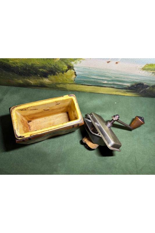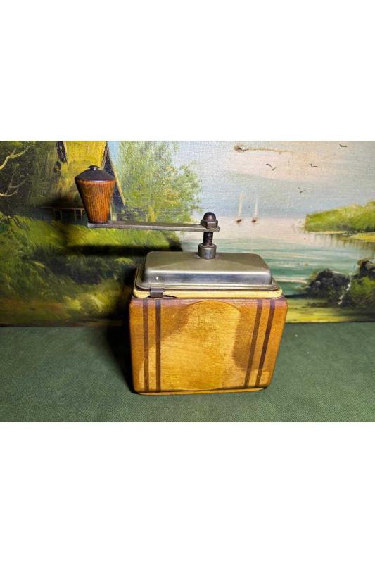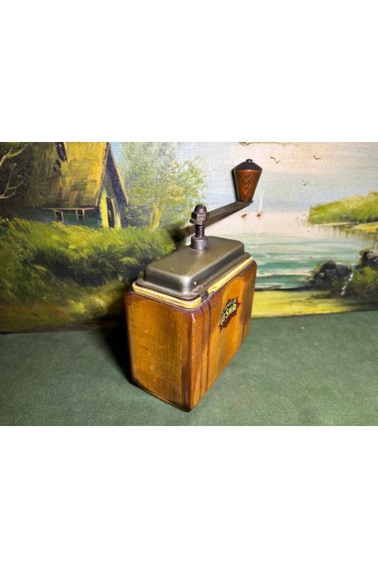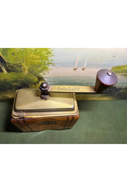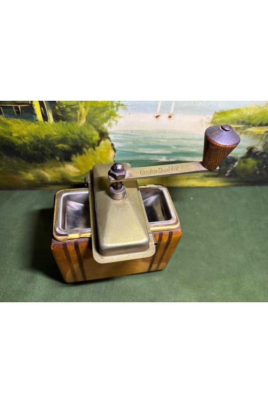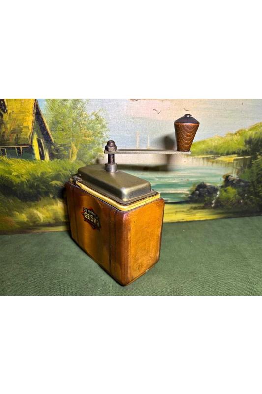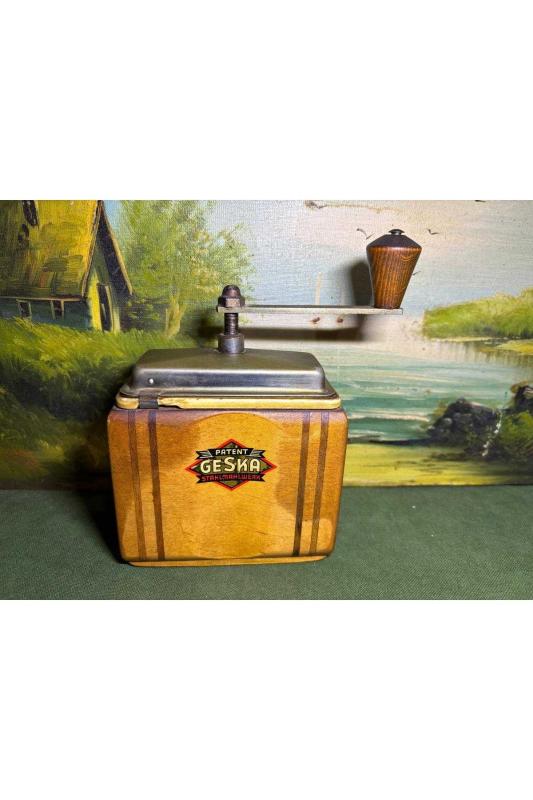 1980 ler alman Geska ahşap kahve değirmeni 13 cm 6,5 cm 19 cm ölçülerinde başlıklı antika/koleksiyon objesinin menşei belirtilmemiştir. Objenin ait olduğu dönem bilinmeketedir.