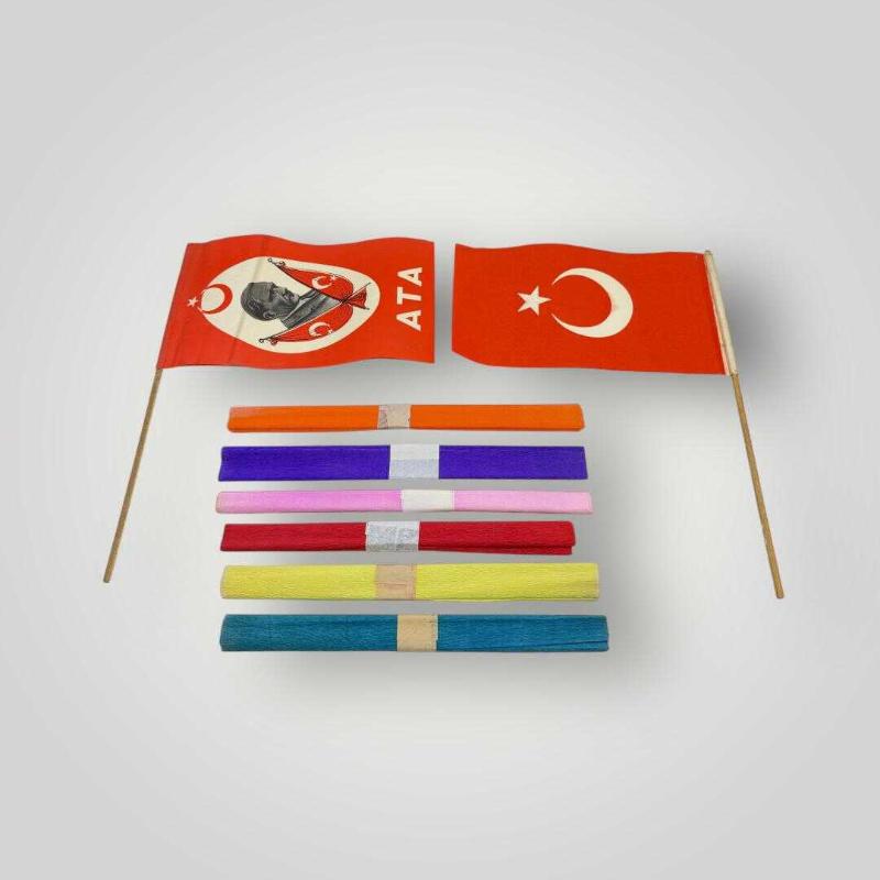 1980's Okul Süsü Abajur Ve Ahşap Saplı Bayrak Lotu AOB5059 başlıklı antika/koleksiyon objesinin menşei belirtilmemiştir. Objenin ait olduğu dönem bilinmeketedir.