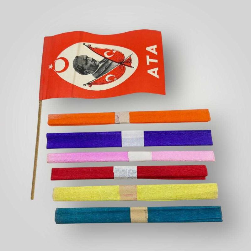 1980's Okul Süsü Abajur Ve Ahşap Saplı Bayrak Lotu AOB5060 başlıklı antika/koleksiyon objesinin menşei belirtilmemiştir. Objenin ait olduğu dönem bilinmeketedir.