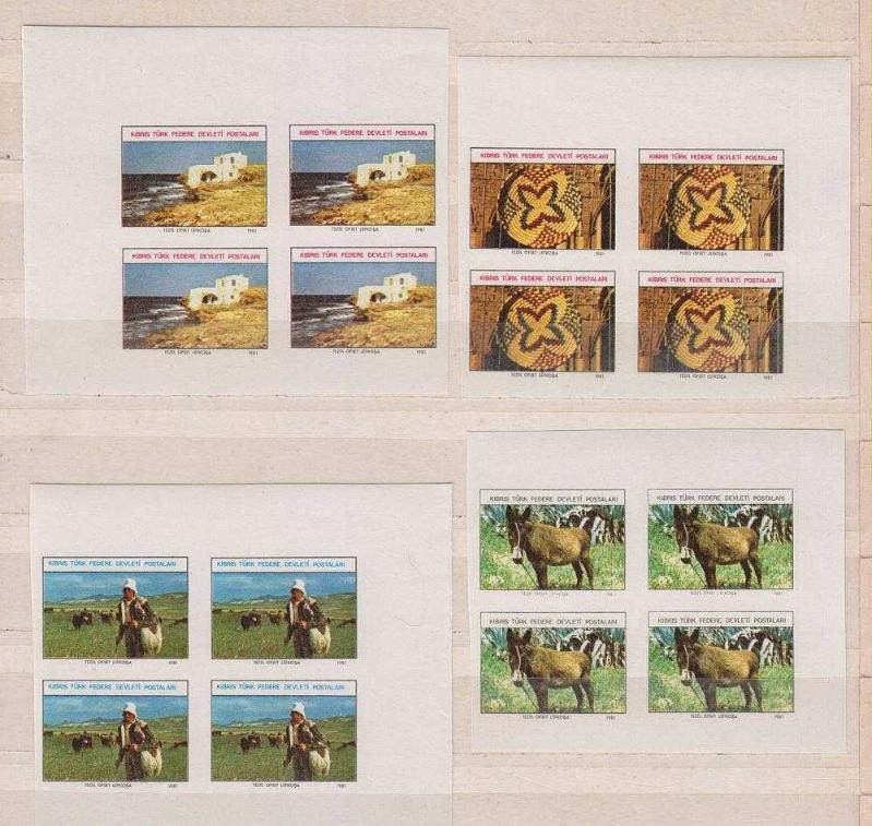 1981 Kıbrıs Türk Federe Devleti Nadir Dantelsiz DENEME Baskıları Damgasız Tezel Ofset Matbaasının Posta idaresine sunduğu deneme baskısı pullardir. 4'lü Blok damgasız, dantelsiz ve orijinal zamklıdır. Pullar muhtemelen beğenilmemiş ve Kıbrıs Posta idaresi tarafından basılmamıştır. Nadir parçalardır