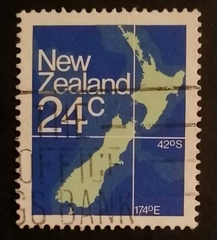 Yeni Zelanda haritası ile ülkenin Güney Pasifik'teki konumunu belirleyen boylam ($174^\circ\text{E}$) ve enlem ($42^\circ\text{S}$) koordinatlarını göstermektedir.
