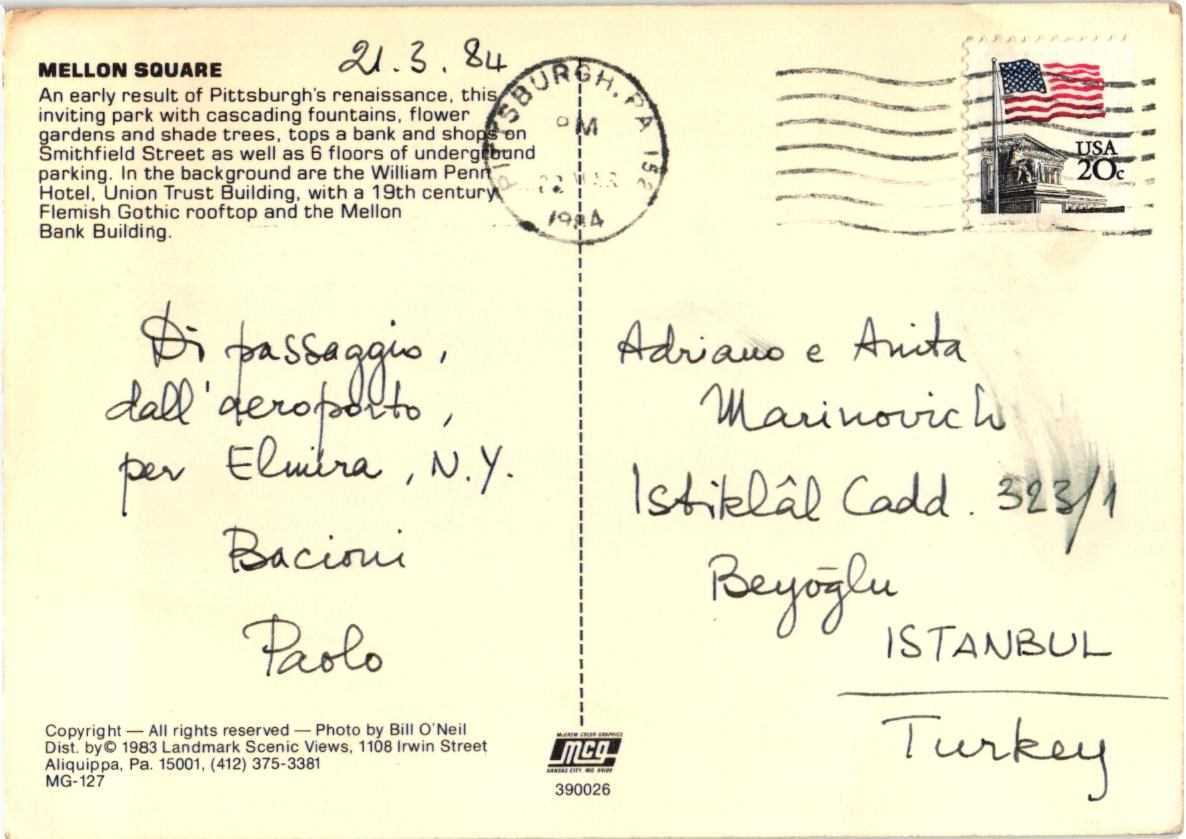 1984 AMERİKA PİTTSBURGH'TAN BEYOĞLU İSTANBUL'A GÖNDERİLMİŞ KARTPOSTAL başlıklı ürün, Efemera, Müzik, Sinema > Kartpostallar > Yabancı Kartpostal > Şehir kategorisi altında İkinci El olarak satılmaktadır.