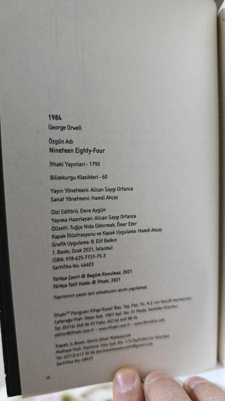 1984, George Orwell tarafından kaleme alınmıştır. Kitap 2021 yılında İTHAKİ yayınları tarafından [İstanbul] 9786257737753 ISBN kodu ile yayınlanmıştır. Satışta olan kitap, yayınevinin 55. baskısıdır. Bu baskının çevirisi Celal Üster tarafından yapılmıştır. 324 sayfadır. 1984 adlı eser Türkçe dilindedir.