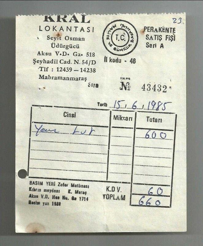 1985 KAHRAMANMARAŞ, KRAL LOKANTASI,SEYİT OSMAN ÜDÜRGÜCÜ PERAKENDE SATIŞ FİŞİ..., 4 yıl önce satışa sunulmuştur.