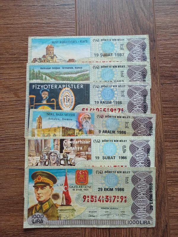 1986-1987 yıllarına ait 6 adet küçük ebat çeşitli piyango bileti
