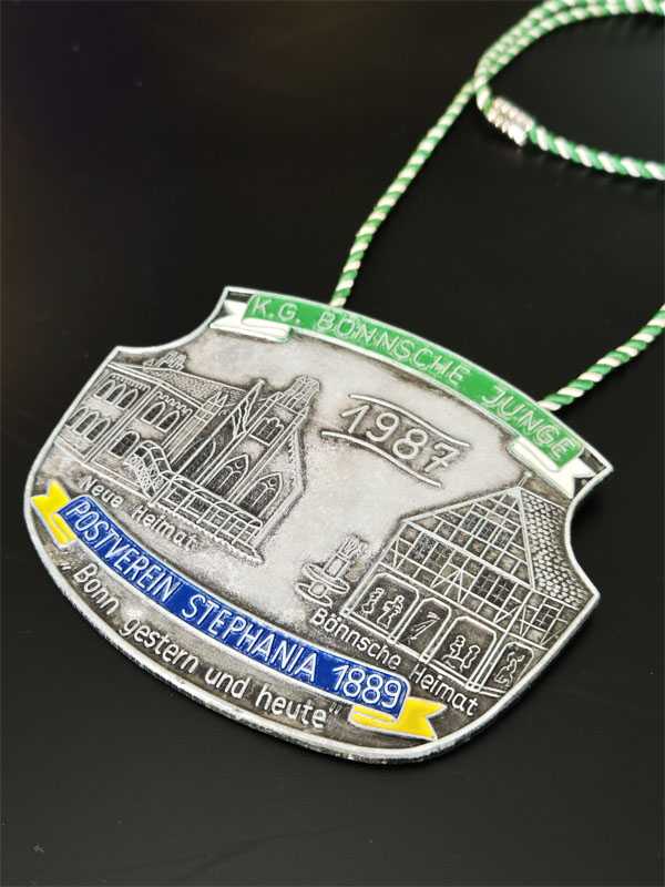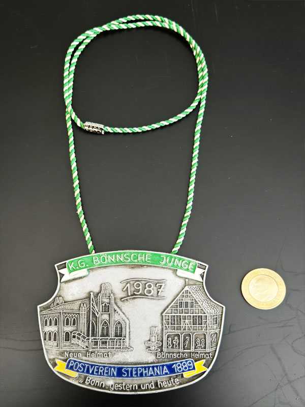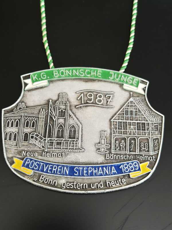 1987 yılına ait, Almanya'nın Bonn şehrindeki tarihi yapıları tasvir eden hatıra amaçlı üretilmiş metal bir madalyon veya rozettir. Tarih: 1987 yılını işaret etmektedir. Tasvir: Madalyon üzerinde "Neue Heimat" (Yeni Vatan) ve "Bönnsche Heimat" (Bonn Vatanı) olarak adlandırılan iki farklı binanın gravürü bulunmaktadır. İlgili Kurum: Üzerinde "K.G. Bönnsche Junge" ve "Postverein Stephania 1889" yazıları yer almaktadır, bu da büyük ihtimalle bir karnaval derneği veya posta kulübü ile bağlantılı olduğunu göstermektedir. Tema: Madalyonun en alt kısmında yer alan "Bonn gestern und heute" ifadesi, "Bonn dün ve bugün" anlamına gelmektedir.