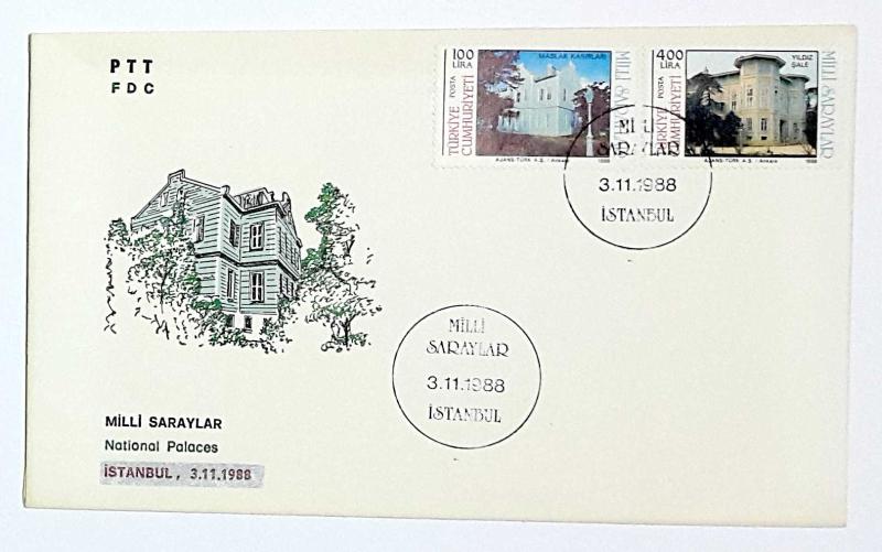 1988 FDC Milli Saraylar, İstanbul, 03.11.1988, PTT M.O.B.Y.D. İlk Gün Zarfı (FDC-405), bir ay önce satışa sunulmuştur.