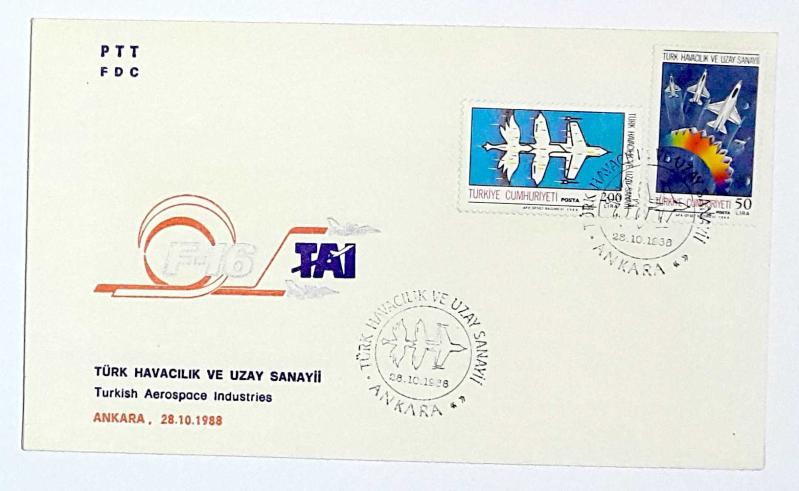 1988 FDC Türk Havacılık ve Uzay Sanayii, Ankara, 28.10.1988, PTT M.O.B.Y.D. İlk Gün Zarfı (FDC-402), bir ay önce satışa sunulmuştur.