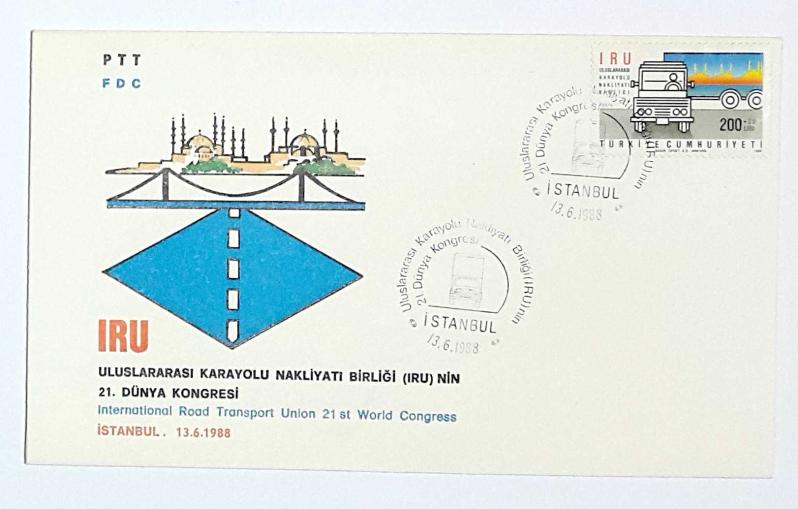 1988 FDC Uluslararası Karayolu Nakliyatı Birliği (IRU), İstanbul, 13.06.1988, PTT M.O.B.Y.D. İlk Gün Zarfı (FDC-395), bir ay önce satışa sunulmuştur.