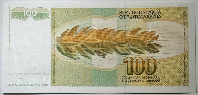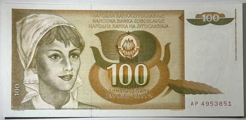 Yugoslavya Merkez Bankası (Narodna Banka Jugoslavije) tarafından basılan 100 Dinar banknottur. Ön yüzde geleneksel kıyafetli kadın portresi yer almakta olup ortada Yugoslavya arması ve “100 Dinara” ibaresi bulunmaktadır. Tasarımda altın ve zeytin tonları hâkimdir. Arka yüzde başak (buğday) figürü yer almakta olup tarım ve üretimi simgelemektedir. Üst bölümde SFR Jugoslavija (Sosyalist Federal Yugoslavya Cumhuriyeti) ibaresi bulunmaktadır. Görselde yer alan seri numarası: AP4953851