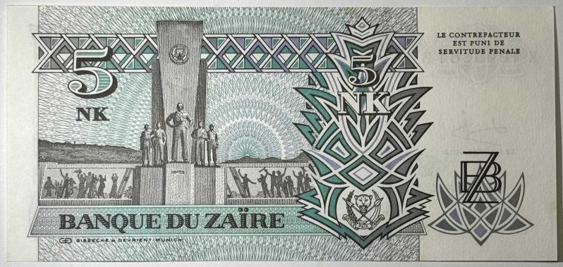 Zaire (günümüz Demokratik Kongo Cumhuriyeti) Merkez Bankası tarafından 24 Haziran 1993 tarihinde basılmış 5 Nouveaux Makuta banknottur. Ön yüzde devlet başkanı portresi ve leopar figürü, arka yüzde ise anıt ve ulusal semboller yer almaktadır. Döneminin karakteristik geometrik desenleri ve detaylı gravür baskısıyla dikkat çeken koleksiyonluk bir parçadır. Görselde yer alan seri numarası: K1890561B