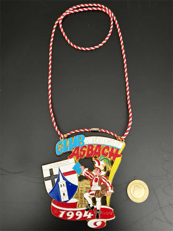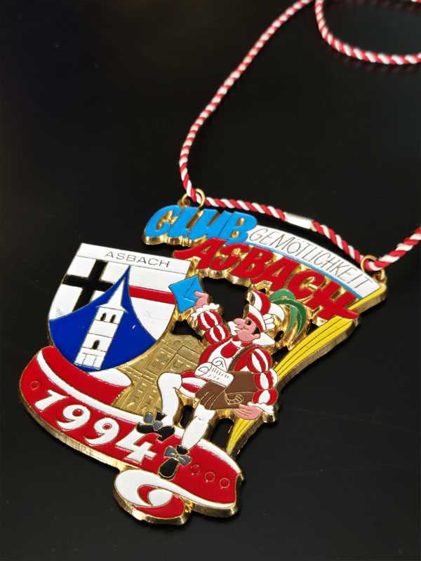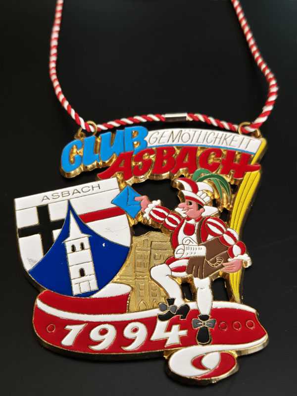Bu tarz madalyonlar, genellikle kulüp üyeleri veya karnaval etkinliklerine katılanlar için özel olarak tasarlanır. Madalyon, renkli emaye detayları ve üzerinde geleneksel bir karnaval figürü barındırır. Kırmızı-beyaz renkli bir kurdele ile asılı durumdadır. Üzerinde "Club Gemütlichkeit Asbach" ve kuruluş yılı olarak "1994" yazmaktadır.