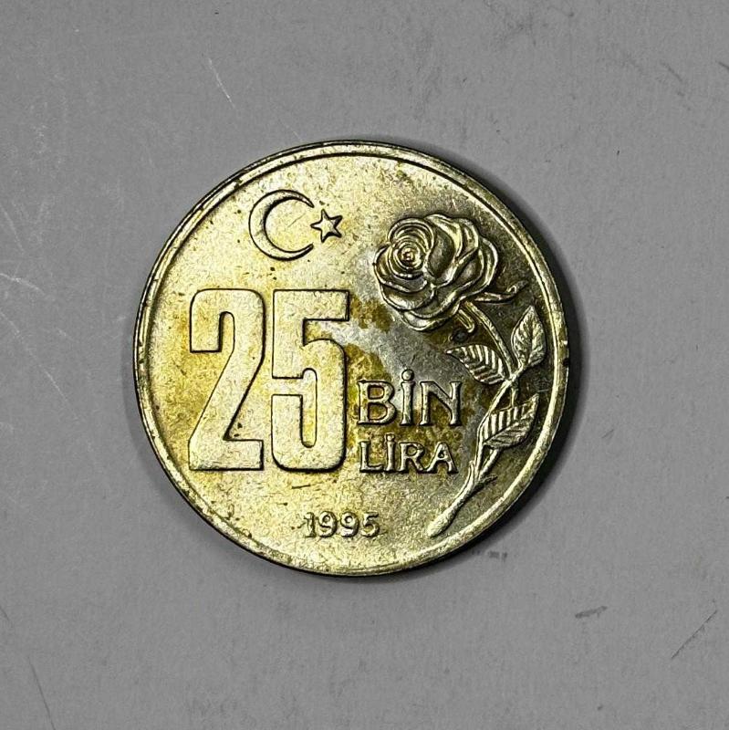 Türkiye Cumhuriyet Merkez Bankası tarafından 1995 yılında basılan 25.000 Türk Lirası madeni para, bakır-nikel alaşımdan üretilmiş olup çil kondisyonda koleksiyonluk bir parçadır. Ön yüzünde Mustafa Kemal Atatürk portresi, arka yüzünde “25 Bin Lira” ibaresi ile gül motifi yer almaktadır. Yüzey detayları nettir, parlaklık korunmuştur. Dolaşım izi bulunmamaktadır veya yok denecek kadar azdır. Koleksiyonluk olarak saklanmış, kondisyonu yüksek bir örnektir. Basım Yılı: 1995 Nominal Değer: 25.000 Türk Lirası Metal: Bakır-Nikel Tür: Madeni Para Kondisyon: Çil Durum: Koleksiyonluk eski para