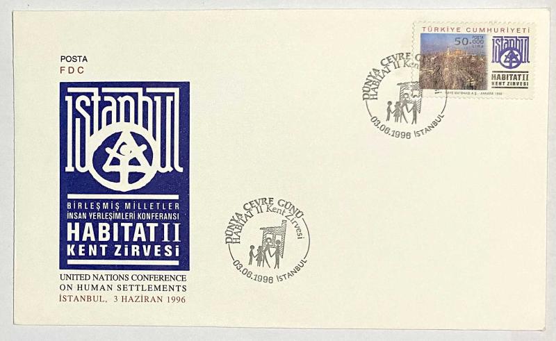 1996 FDC Dünya Çevre Günü - Habitat II Kent Zirvesi, İstanbul, 03.06.1996, PTT M.O.B.Y.D. İlk Gün Zarfı (FDC-509) Fotoğraflar gönderilecek ürüne aittir. Fatura gönderilmeyecektir. Kargo bilgisi ve diğer ürünlerim için mağazama göz atabilirsiniz.
