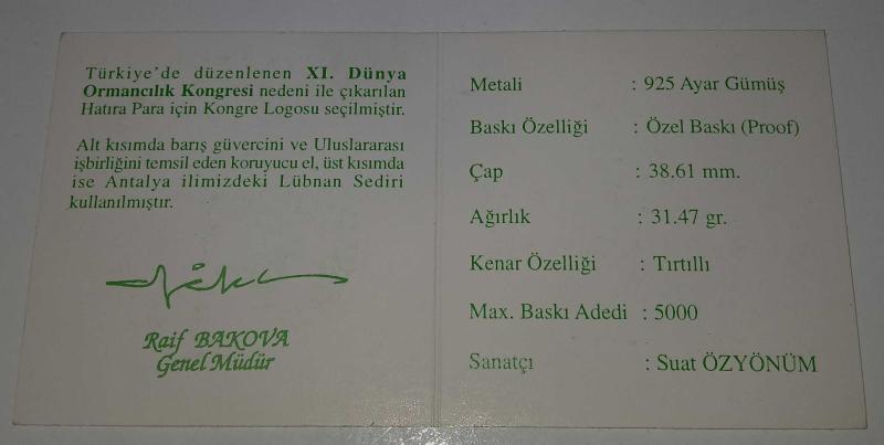 1997 DÜNYA ORMANCILIK KONGRESİ HATIRA PARA SERTİFİKASI, 11 ay önce satışa sunulmuştur.