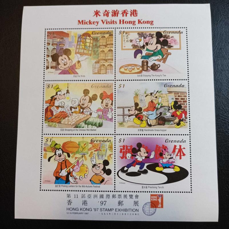 1997 Hong Kong Pul Sergisi için Grenada tarafından çıkarılan "Mickey Hong Kong'u Ziyaret Ediyor" temalı hatıra pul bloğu MNH