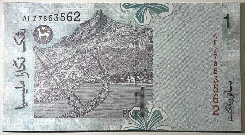 Malezya Merkez Bankası (Bank Negara Malaysia) tarafından tedavüle çıkarılan 1 Ringgit banknottur. Ön yüzde Malezya’nın ilk Yang di-Pertuan Agong’u olan Tuanku Abdul Rahman portresi yer almaktadır. Arka yüzde ise geleneksel Malezya sanatını ve kültürel mirası temsil eden “Wau Bulan” (geleneksel ay uçurtması) figürü ve doğal manzara tasviri bulunmaktadır. Modern güvenlik şeritleri ve mikro desenler ile tasarlanmış koleksiyonluk bir parçadır. Görselde yer alan seri numarası: AFZ7863562