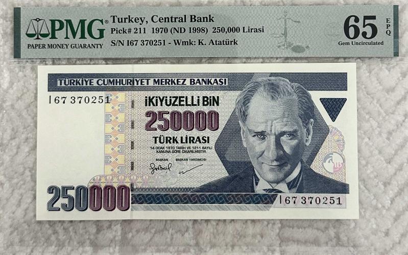 1998 TC 7.Emisyon 250 BinTürk Lirası kağıt para banknot Pick#211 PMG sertifikalı 65-ÇİL kolleksiyonluk, en son 2 gün önce güncellenmiştir.