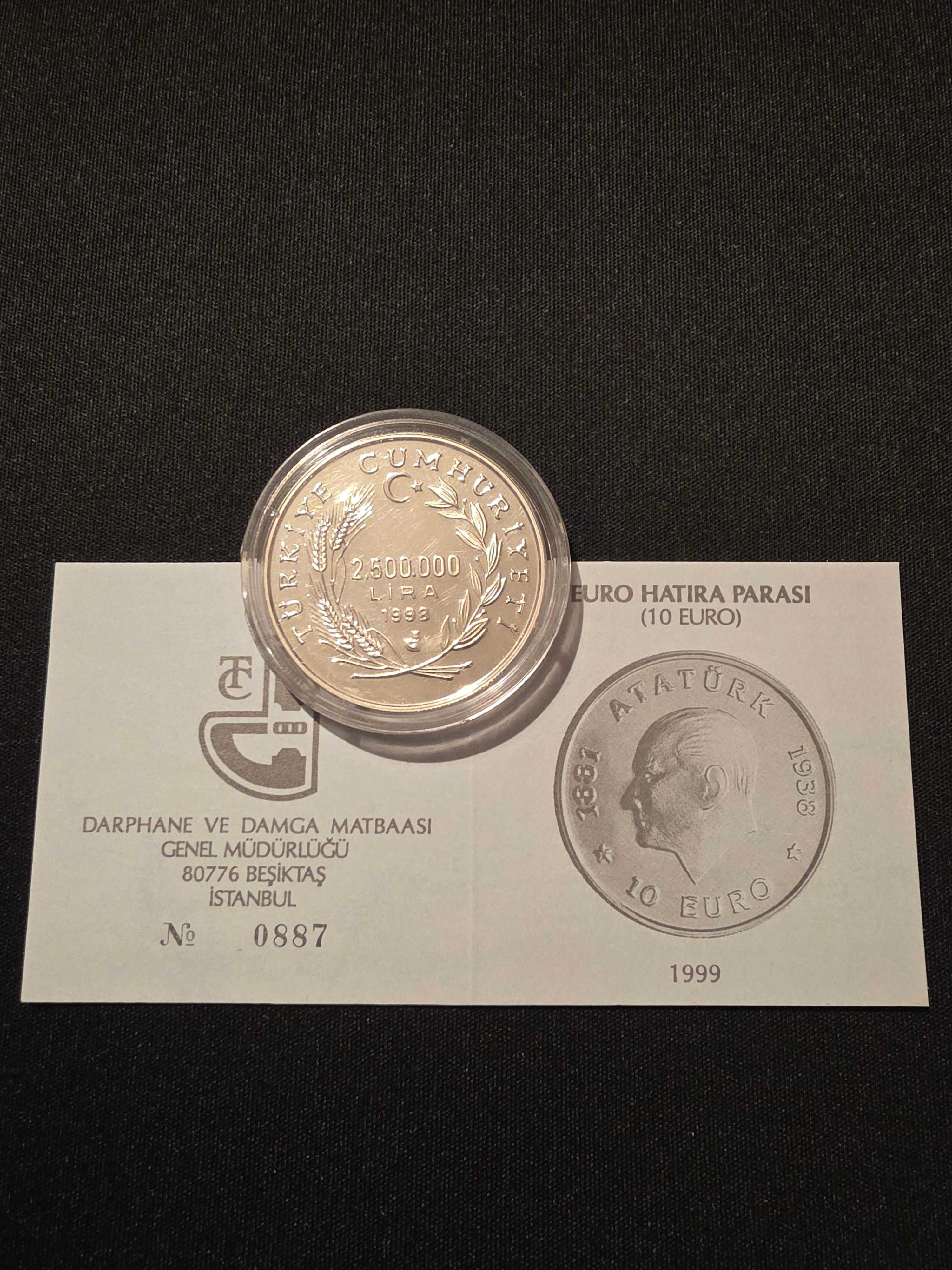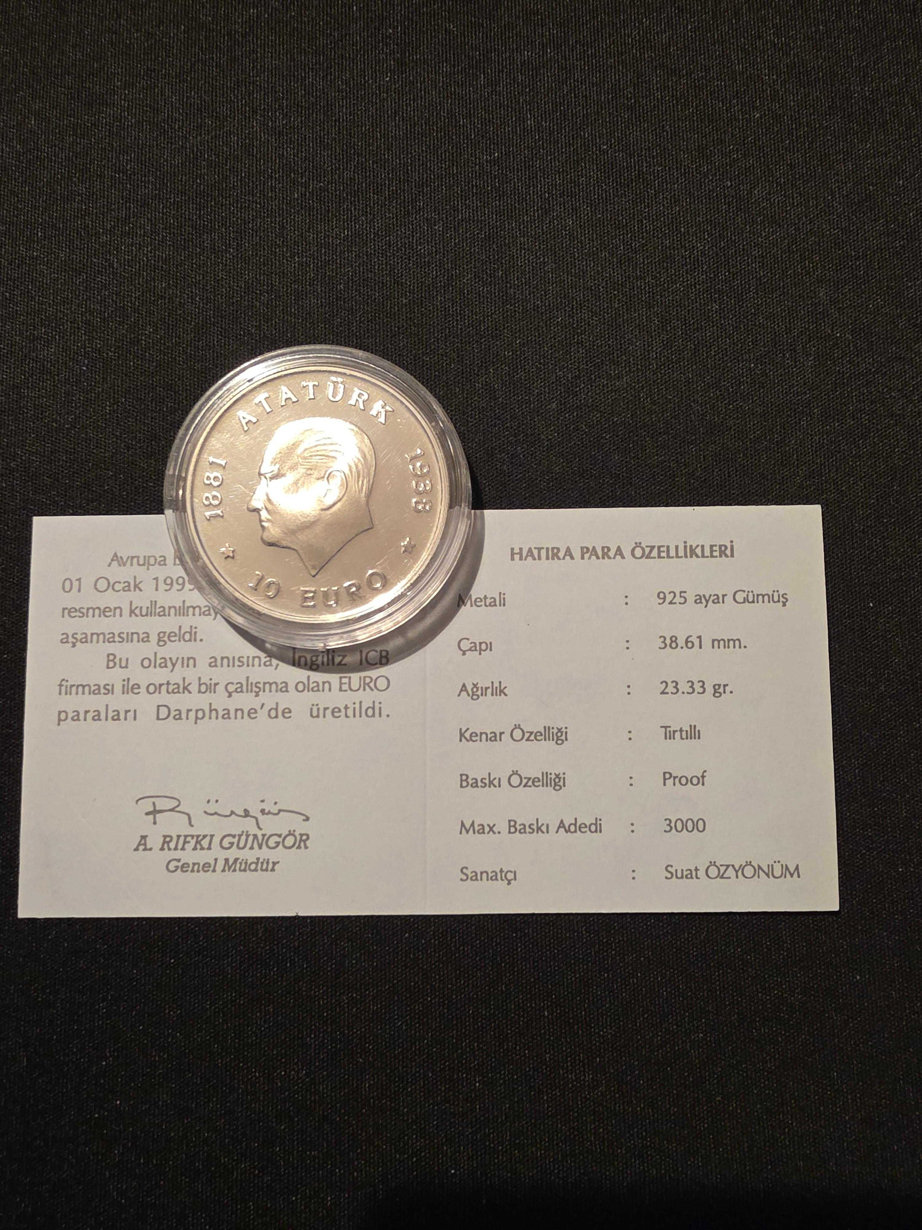 1998 YILI ATATÜRK 10 EURO DARPHANE HATIRA GÜMÜŞ SERTİFİKALI
