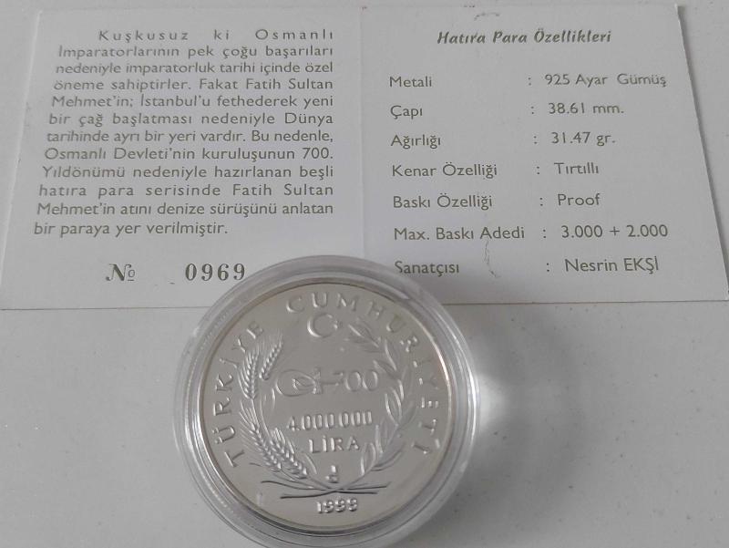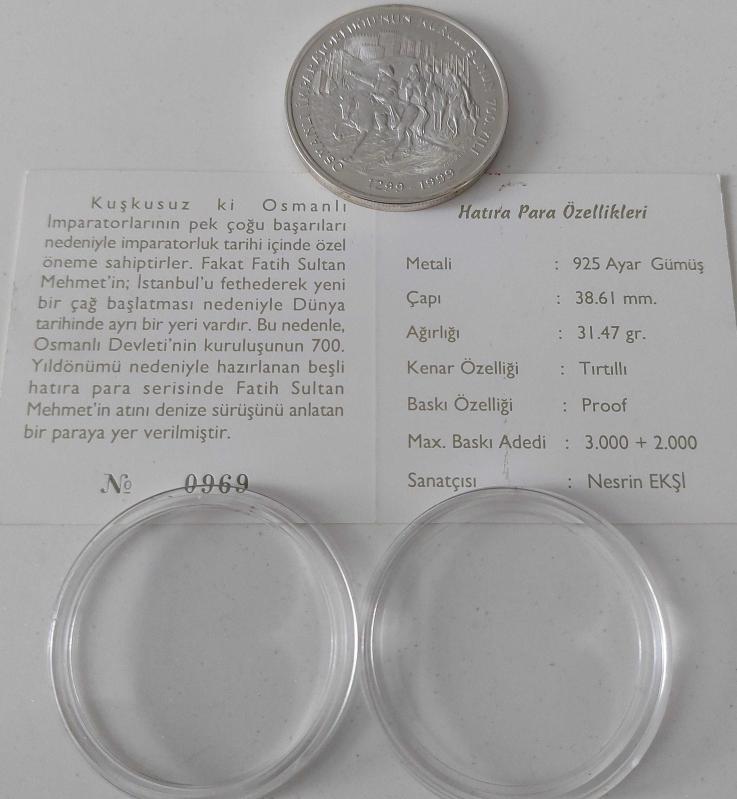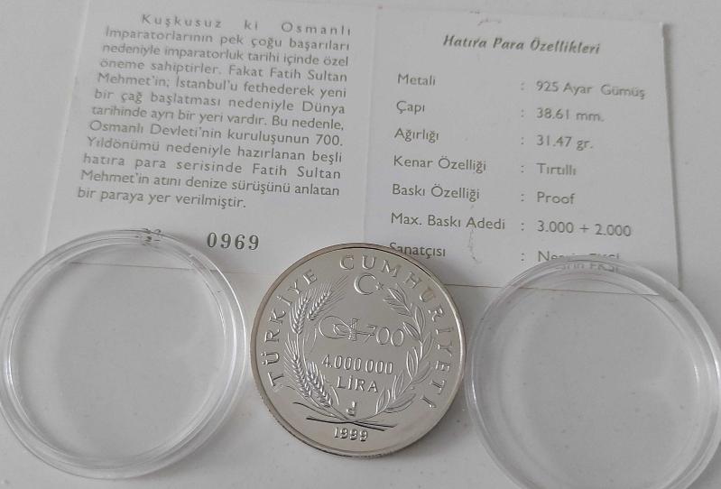 1999 OSMANLI İMPARATORLUĞUNUN KURULUŞUNUN 700.YILI FATİH SULTAN MEHMET GÜMÜŞ 4.000.000 LİRA HATIRA PARASI ORİJİNAL 0969 SERTİFİKALI NOLU ÇİL ÇOK NADİR, 1 yıl önce satışa sunulmuştur.