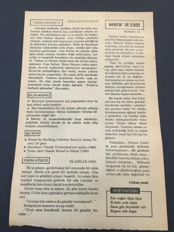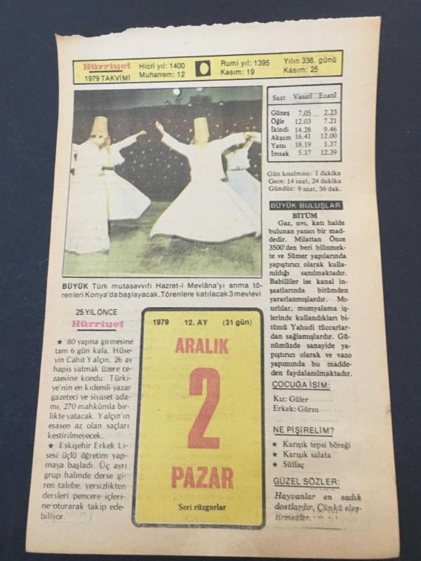 2 ARALIK 1979 -TAKVİM YAPRAĞI-DOĞUM GÜNÜ HEDİYESİ-HÜRRİYET TAKVİMİ,ÇOCUĞA İSİM,TARİH SOHBETİ CEM SULTAN OLAYI,KONYADA MEVLANAYI ANMA TÖRENİ,KARADENİNZ TEKNİK ÜNİVERSİTESİNİN KURULUŞU 1962,NAMIK KEMALİN ÖLÜMÜ 1888, en son 8 ay önce güncellenmiştir.