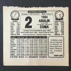 2 ARALIK 1994 -TAKVİM YAPRAĞI-DOĞUM GÜNÜ HEDİYESİ-FATİH HAK VE HİZMET VAKFI TAKVİMİ,KARADENİZ TEKNİK ÜNİVERSİTESİNİN AÇILIŞI 1962,NAMIK KEMALİN ÖLÜMÜ 1888,MARS A İLK ARAÇ İNDİ 1974,PEYGAMBERİMİZİN HAKEMLİĞİ