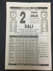 2 ARALIK 2003-TAKVİM YAPRAĞI-DOĞUM GÜNÜ HEDİYESİ-TÜRKİYE GAZETESİ TAKVİMİ,KARADENİZ TEKNİK ÜNİVERSİTESİNİN AÇILIŞI,1962,NAMIK KEMALIN VEFATI 1888,VAKIF MEDENİYETİ başlıklı ürün, Efemera, Müzik, Sinema > Belge ve Evraklar > Takvimler kategorisi altında İkinci El olarak satılmaktadır.