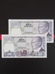 2 Adet Sıralı Takipli 7. Emisyon 1.000 Türk Lirası Eski Koleksiyon Kağıt Para. T.C Banknotlar. Cumhuriyet Dönemi.
