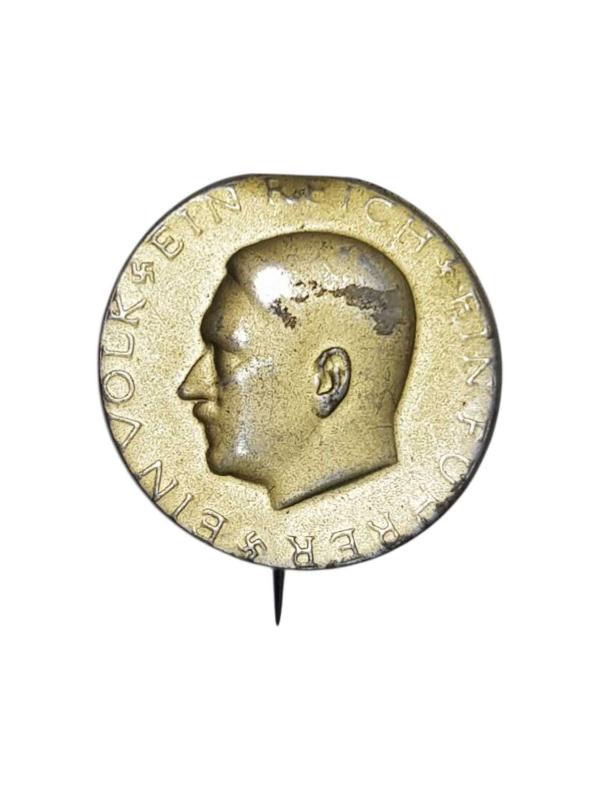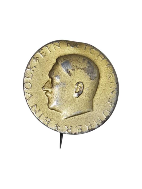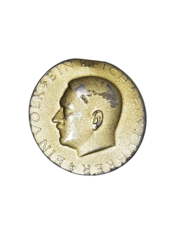 2. DÜNYA SAVAŞI DÖNEMİ NAZİ ALMAN DOKTRİNİ "EIN VOLK, EIN REISCH, EIN FUHRER" (TEK MİLLET, TEK DEVLET, TEK LİDER) YAZILI, GAMALI HAÇLARLA SÜSLÜ VE ADOLF HITLER RESİMLİ NADİR ROZET. ORJİNALDİR. ÇAP:2,7 CM