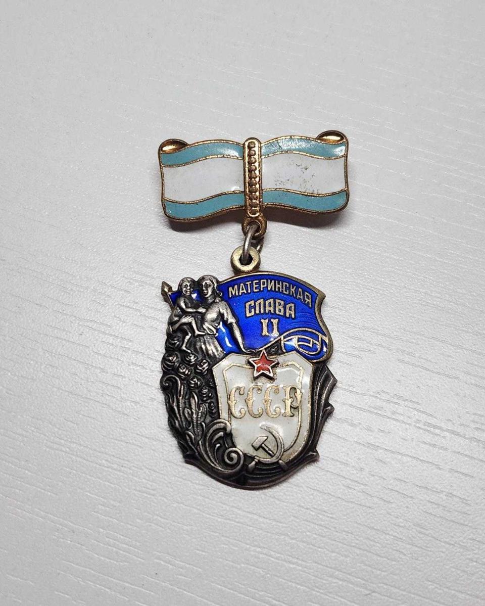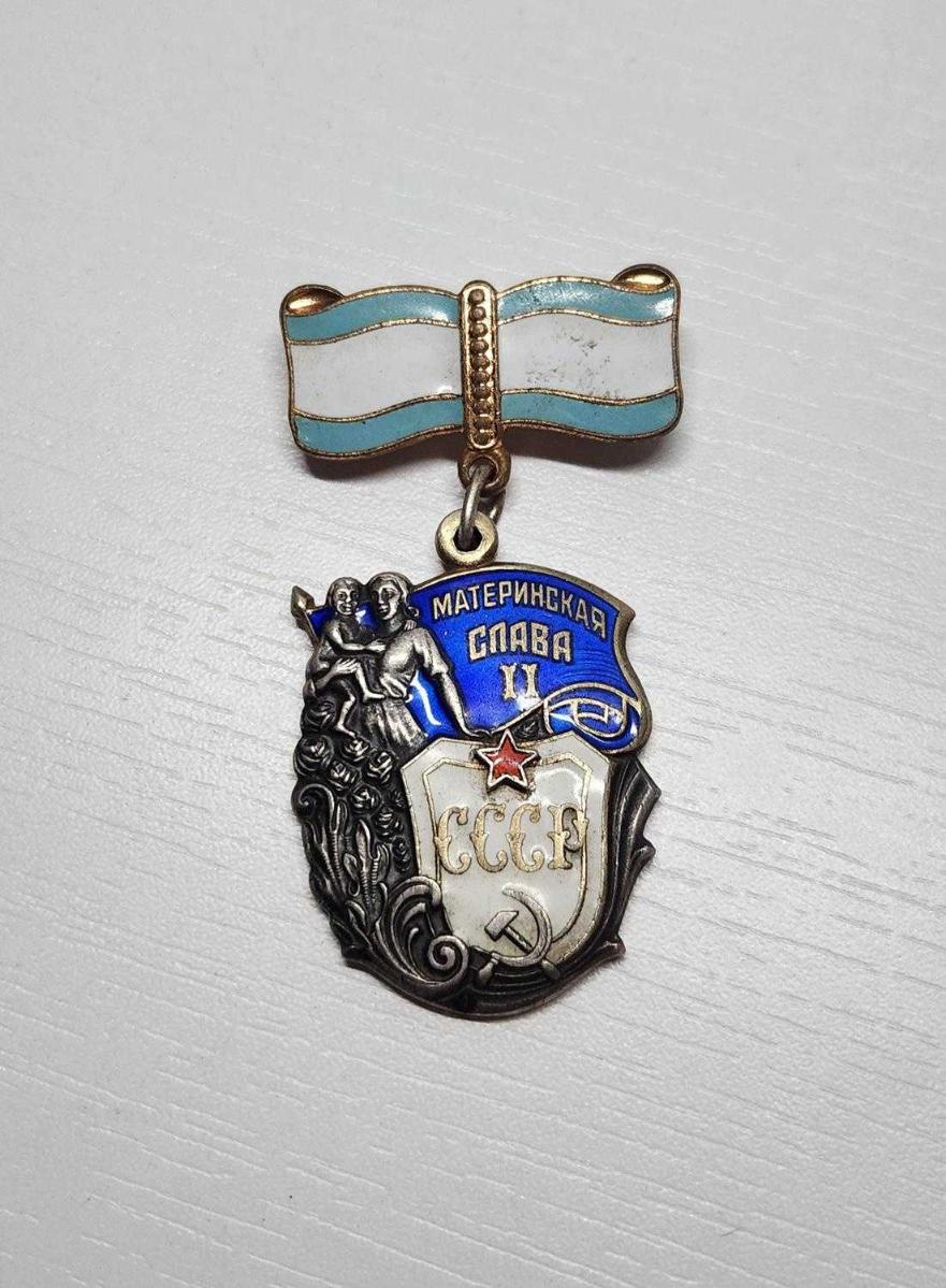 2. DÜNYA SAVAŞI DÖNEMİ SOVYET RUSYA 2. SINIF, MİNELİ GÜMÜŞ ANNELİK MADALYASI. YÜKSEKLİK: 6 CM A ĞIRLIK: 27,6 GR 1. sınıf: 9 çocuk taşıyan ve yetiştiren anneler; 2. sınıf: 8 çocuk sahibi ve yetiştiren anneler; 3. sınıf: 7 çocuk sahibi ve yetiştiren anneler.