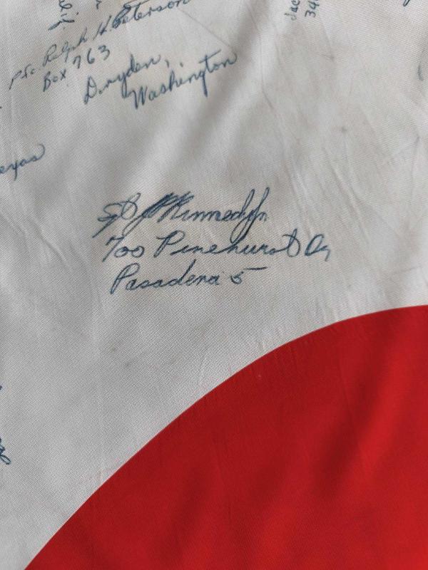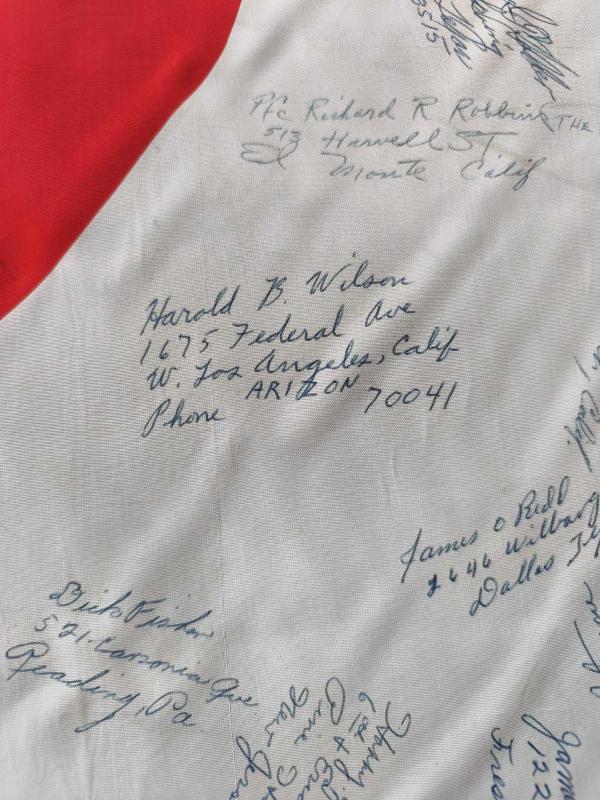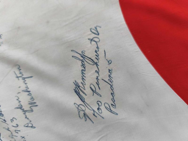 2. Dünya Savaşı Abd ve Japonya arasında olan Peleliu adası savaşında Amerikan askerleri tarafından ele geçirilmiş üzeri ABD askerleri tarafından anı olarak imzalanmış ipek Japon bayragı. Bayrak savaşta görev yapmış amerikan askerleri tarafından Good Luck Flag olarak anılmış. Benzerleri ABD müzeleri ve özel koleksiyonlarında bulunmakta. Çogunda japonca yazılar mevcut olsa da elimizdeki örnekte adada savaşmış askerlerin imzaları var. Japonlar bu bayraga eve dön benzeri bir istemle askerlerine verirmiş. 97*75 cm ebadında ve ipek bayrak uzun yıllar önce Ankaralı bir koleksiyoner tarafından ABD'den getirilmiş. Muhtemelen savaşta hayatını kaybeden bir Japon askerine ait. Not : Görseller arasındaki siyah beyaz fotograf bayrak üzerinde imzası bulunan askerlerle ilgisi yoktur. Peleliu muharrebesinden bir kare olarak görsel amaçka yayınlanmıştır.