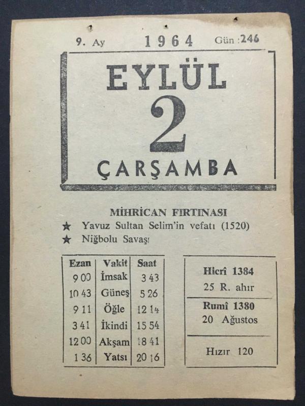 2 EKİM 1964-TAKVİM YAPRAĞI-DOĞUM GÜNÜ HEDİYESİ,KUŞ GEÇİMİ FIRTINASI,ŞAİR NEDİMİN ÖLÜMÜ,1730,GANDİNİN DOĞUMU,1869,HUTBE başlıklı ürün, Efemera, Müzik, Sinema > Belge ve Evraklar > Takvimler kategorisi altında İkinci El olarak satılmaktadır.