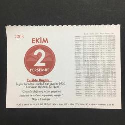 2 EKİM 2008 -TAKVİM YAPRAĞI-DOĞUM GÜNÜ HEDİYESİ-KUVEYT TÜRK TAKVİMİ,İNGİLİZ BİRLİKLERİ İSTANBULDAN AYRILDI,1923,RAMAZAN BAYRAMI 3.GÜN,BAYRAM ZİYARETLERİ,BİR NASİHAT,GÜNÜN TARİHİ İŞGAL KUVVETLERİ İSTANBULU TERK EDİYOR,KISSADAN HİSSE başlıklı ürün, Efemera, Müzik, Sinema > Belge ve Evraklar > Takvimler kategorisi altında İkinci El olarak satılmaktadır.