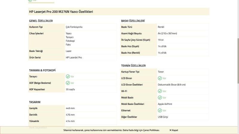HP Laserjet Pro 200 M276N Yazıcı ÖzellikleriGENEL ÖZELLİKLER Kullanım Tipi Çok Fonksiyonlu Cihaz İşlevleri Yazıcı Tarayıcı Fotokopi Faks Baskı Tekniği Lazer Ürün Serisi HP LaserJet Pro BASKI ÖZELLİKLERİ Baskı Türü Renkli Azami Kağıt Boyutu A4 (210 x 397mm) İlk Sayfa Çıkış Süresi (Siyah) 19 sn Baskı Hızı (Siyah) 14 sf/dk Baskı Hızı (Renkli) 14 sf/dk TEKNİK ÖZELLİKLER Kartuş/Toner Tipi Toner LCD Ekran Var LCD Ekran Özellikleri Dokunmatik Ekran (8.9 cm) Wi-Fi Var Mobil Baskı Var Mobil Baskı Özellikleri Apple AirPrint Ethernet Var Diğer Özellikler USB Girişi TARAMA & FOTOKOPİ Tarayıcı Var ADF (Belge Besleme) Var ADF Kapasitesi 35 sayfa TASARIM Genişlik 449 mm Derinlik 476 mm Yükseklik 414 mm